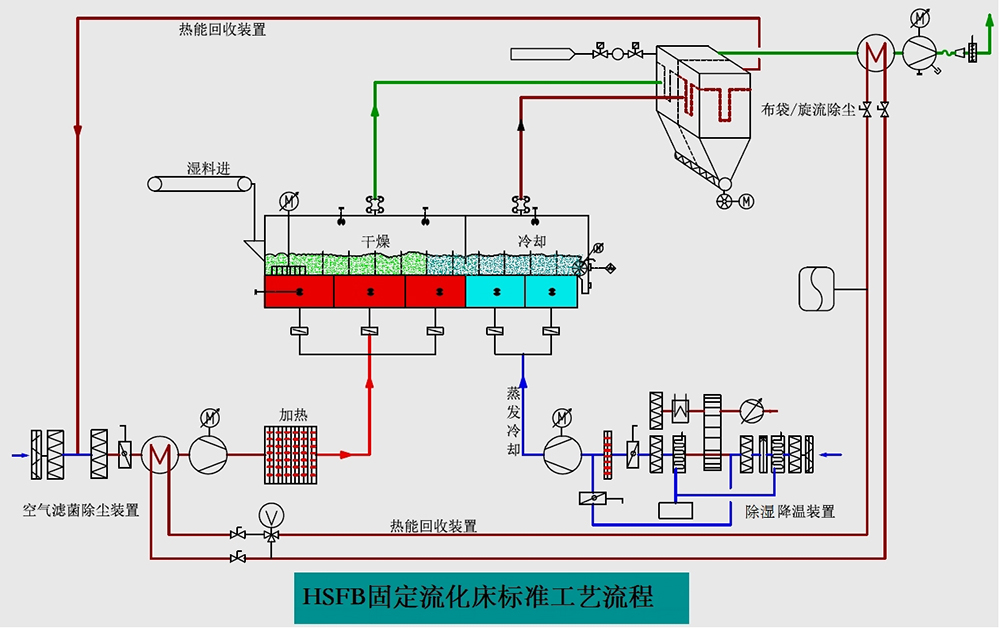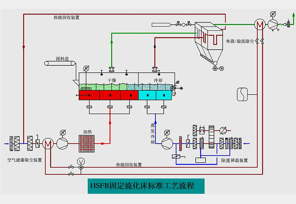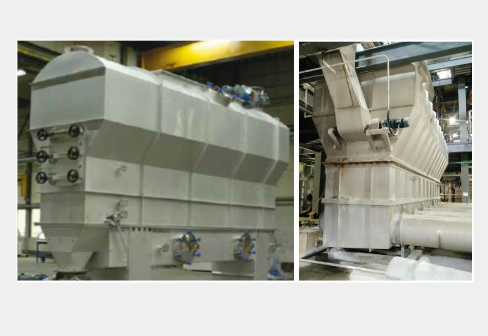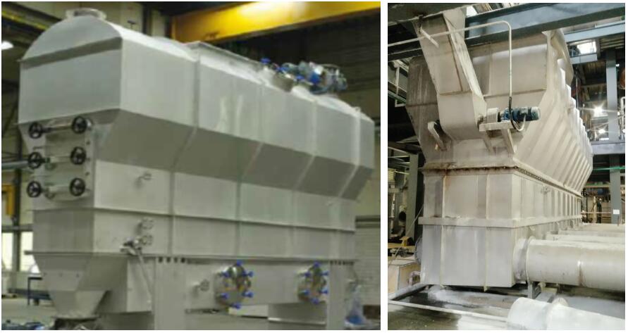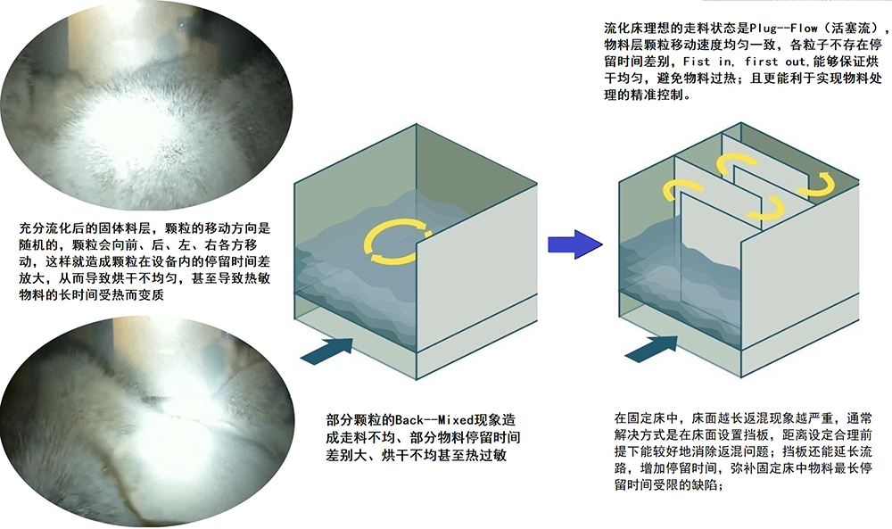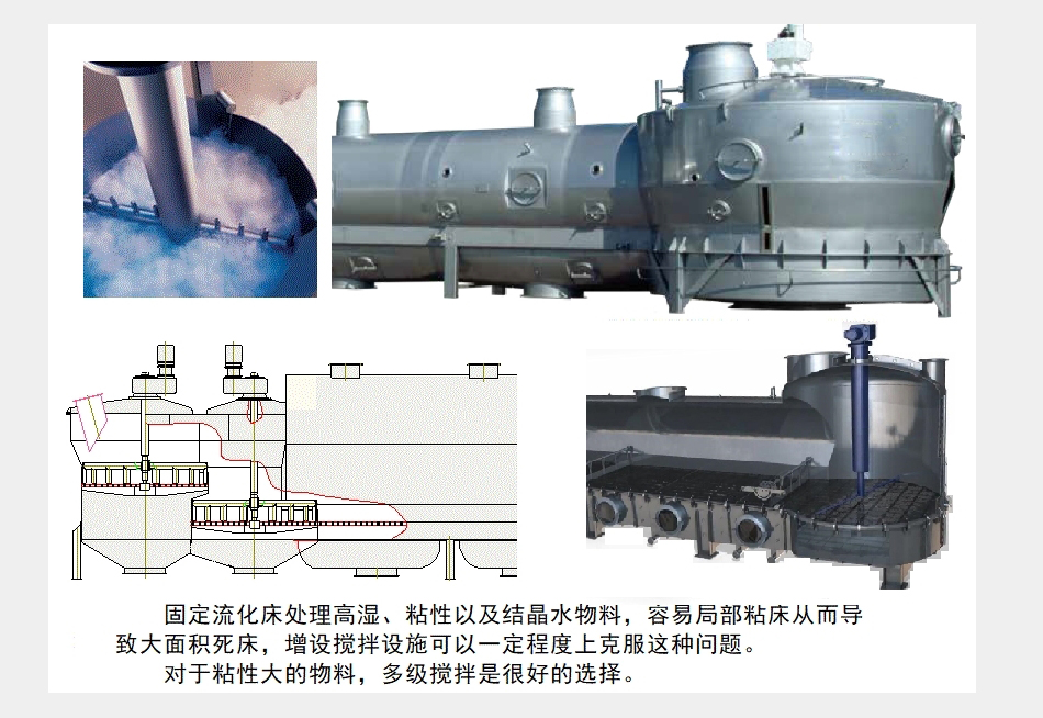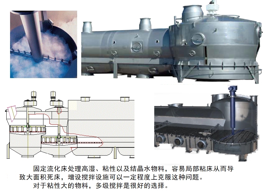 常規(guī)固定流化床能處理松散且具備流動性的固體粉粒體,對于粘性粉?;蚋吆某頎罘垠w,不能正常地沸騰流化。我們給HSFB固定流化床增加攪拌器,在床子進(jìn)料端將物料攪動、鏟起、分散,讓熱風(fēng)快速將濕料表面水蒸發(fā),顆粒便具備了松散特征,在離開攪拌區(qū)之后,便能正常的沸騰流化。一些晶體物料,在烘干過程中會有結(jié)晶水析出,會影響流化床的運行,此時可以通過調(diào)整工況、增設(shè)攪拌等方法解決。