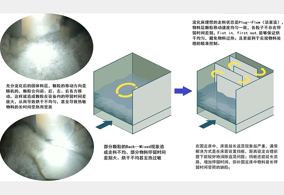 為消除這種缺陷,HSFB固定床在中會增設(shè)若干防止返混的內(nèi)構(gòu)件、臺階,減少返混,同時還可以延長物料流路,在較短的床面長度上實現(xiàn)長時間停留,增加物料停留時間,適應(yīng)于低溫烘干或者高含水物料烘干工藝要求。