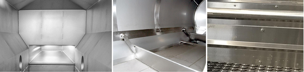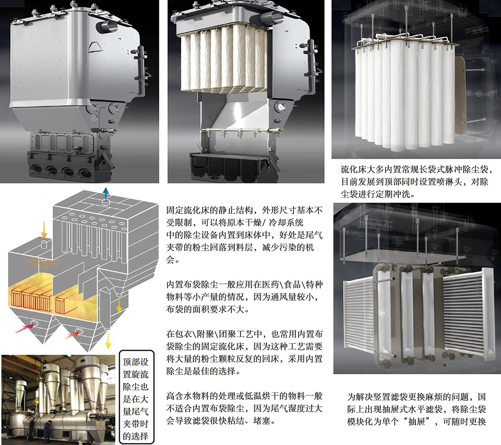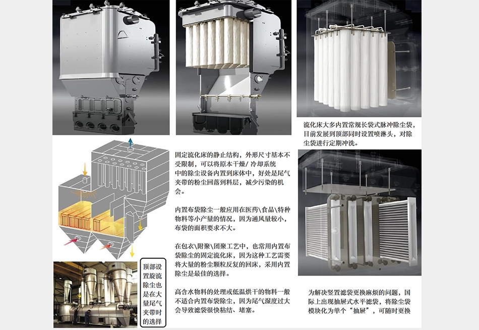 不同物料在處理時,工藝要求和重點不一樣,需要采用不同類型的床板,例如單向魚鱗孔、多向鴨嘴孔、斜孔床板、蘑菇頭帽式床板、斗笠帽床板、噴涂特氟龍床板;細(xì)孔式床板等等,各自有不同的工藝表現(xiàn)。物料粘床、漏料、尾氣夾帶、吹穿、粒徑過大等等問題都能得到很好的解決。