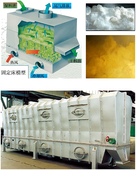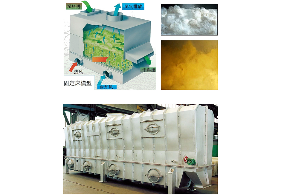 固定床適用于多種粘性不強的粉粒狀物料,如聚乙烯、農藥、人造肉、硫酸銅、食鹽等,對顆粒度均勻、含濕量不高、流動性好的物料適應性比較好,它比袋式烘干機、烘箱占地面積小、生產能力大、熱效率高,且干燥后的產品濕度比較均勻。比氣流干燥停留時間的長,使成品達到預期含水率。