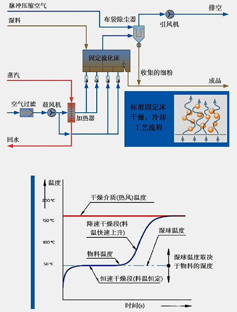 濕料以一定速率向固定床前端連續(xù)進料,干燥后產品從另一端連續(xù)卸出。熱風通過床板后以錯流方式穿過物料,熱能由熱空氣傳給濕料表面,進行直接 加熱、干燥、煅燒、或冷卻;物料在熱風作用下沸騰流化,顆粒相互混合、碰撞,整體保持一個定向移動的流化狀態(tài)。熱能傳遞給物料,表面水吸收熱能后蒸發(fā),以氣態(tài)形式揮發(fā),同時物料溫度上升,熱風溫度降低,這個過程就是流態(tài)化烘干的熱質傳遞模式。