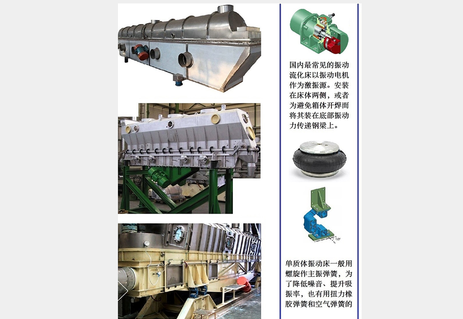 振動電機(jī)流化床走料速度可調(diào)范圍小,床面長度有限,一般最長停留時間15min左右,導(dǎo)致適應(yīng)范圍有限,單機(jī)不適合需長時間烘干的工況。另外這種結(jié)構(gòu)床體的振頻與振幅成反比,所以電機(jī)轉(zhuǎn)速與走料速度構(gòu)不呈線性關(guān)系,很難通過采用變頻等方式在線控制走料速度。