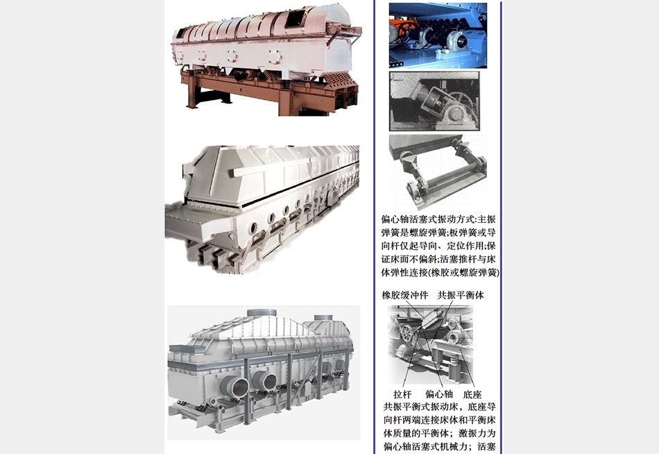 活塞式偏心振動結(jié)構(gòu)一般大量應(yīng)用在短程輸送機(jī)上,它的振動床振幅較大,且不可調(diào)節(jié),在運(yùn)行時走料速度很快,是所有振動床中較快的一種。這樣快的速度不適合應(yīng)用在烘干機(jī)上,因?yàn)槲锪贤A魰r間太短,在脫水量指標(biāo)比較大時,活塞式振動床難以勝任。