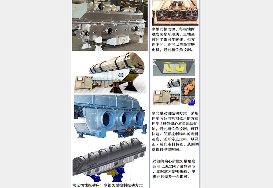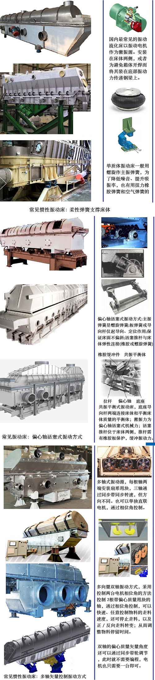 很多工況:固定床的適應(yīng)范圍受限、有些物料烘干時無需充分沸騰/或者難以流化、長時間烘干的物料需消除返混降低停留時間差、以及為降低風(fēng)機(jī)電耗和熱能損耗,這時振動輸送技術(shù)被運(yùn)用到流化床上,這就是振動流化床干燥/冷卻技術(shù)。單純從歷史看,從技術(shù)角度比較,振動流化床技術(shù)高于固定流化床;從國外實(shí)踐來講,目前為止固定床的絕大部分基礎(chǔ)功能和延伸擴(kuò)展功能都能夠在振動床上實(shí)現(xiàn),包括內(nèi)加熱、內(nèi)置濾袋、內(nèi)置噴頭、大型化等等,而且振動床還具備固定床所不具備的其它功能,比如更節(jié)能、走料均勻、適應(yīng)復(fù)雜的物料、操作更簡單、減少人工、易實(shí)現(xiàn)完全自動控制等等。